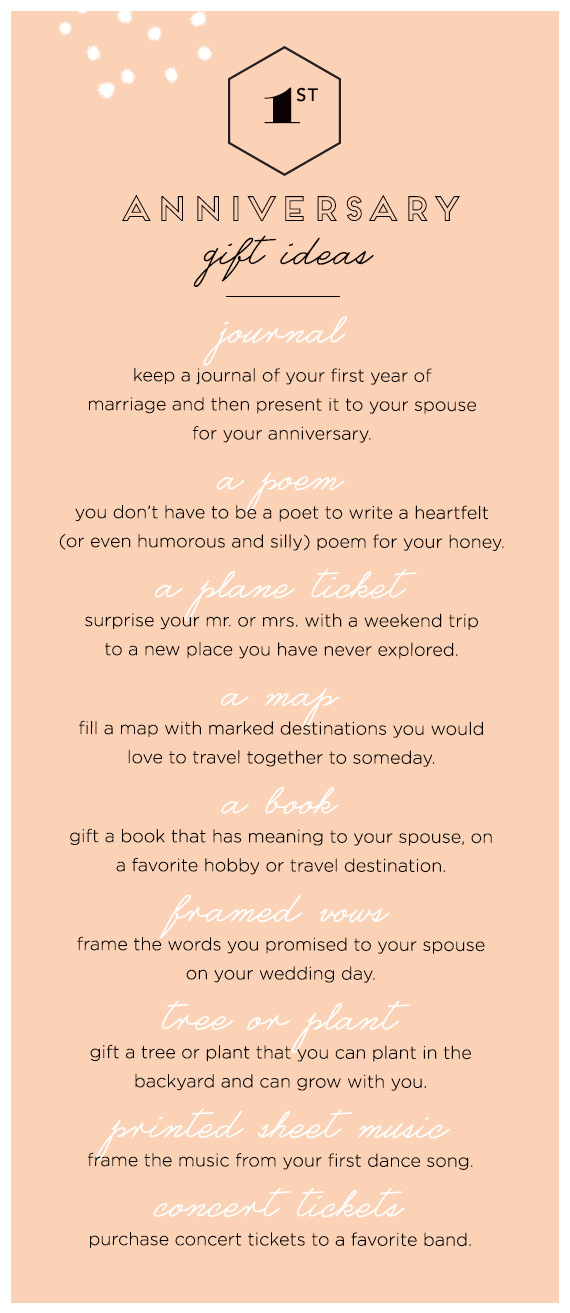 Ideas For First Anniversary : 1st Wedding Anniversary Gift Ideas Paper Wedding Anniversary Gift Ideas : Here are some ideas for fun places to go for your anniversary whether you plan to stay local or head somewhere new.. A set of etched champagne flutes. The gift element for the first wedding anniversary is paper. It blends tradition with fresh inspiration, and since we think every year is important, there are creative gift ideas for every single anniversary, from the first to the sixtieth. For example, they may include a bouquet of paper flowers, a long handwritten letter, or even a printed poem. Johner images / getty images sometimes a traditional or modern gift might not work for you.